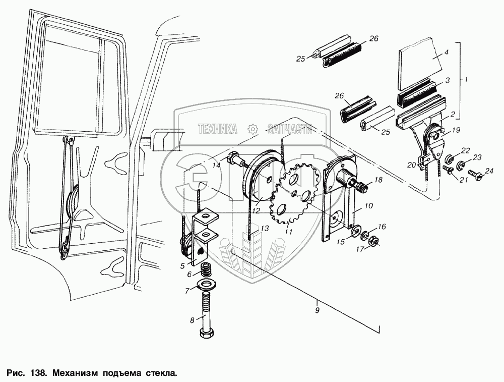 Каталог запасных частей к технике: МАЗ-6303. Механизм подъема стекла