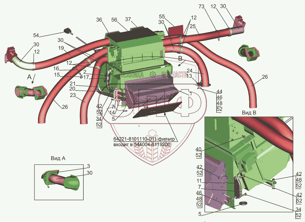 Каталог запасных частей к технике: МАЗ-631019. Установка отопителя 631019-8100001