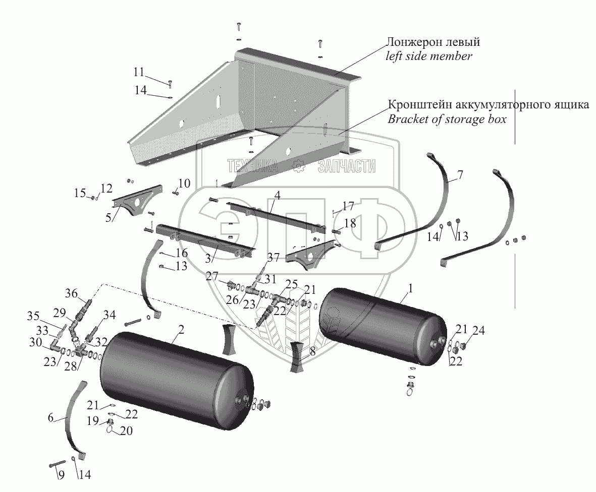 Каталог запасных частей к технике: МАЗ-631236. Установка ресиверов и присоединительной арматуры