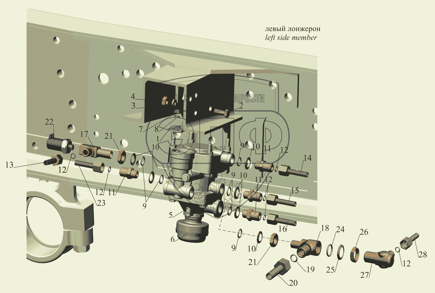 Каталог запасных частей к технике: МАЗ-642505, 642508. Установка клапана прицепа