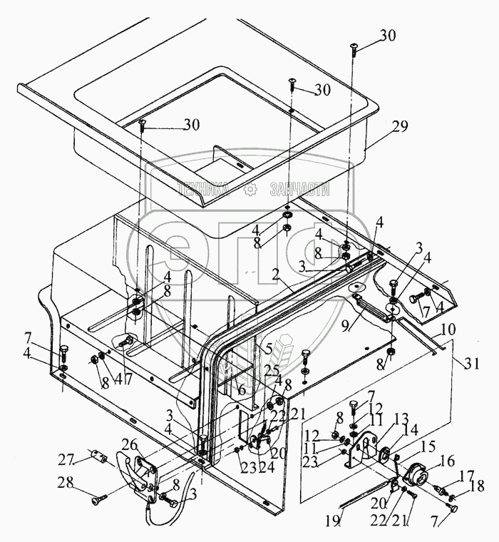 Каталог запасных частей к технике: МАЗ-643068. Установка инструментального ящика