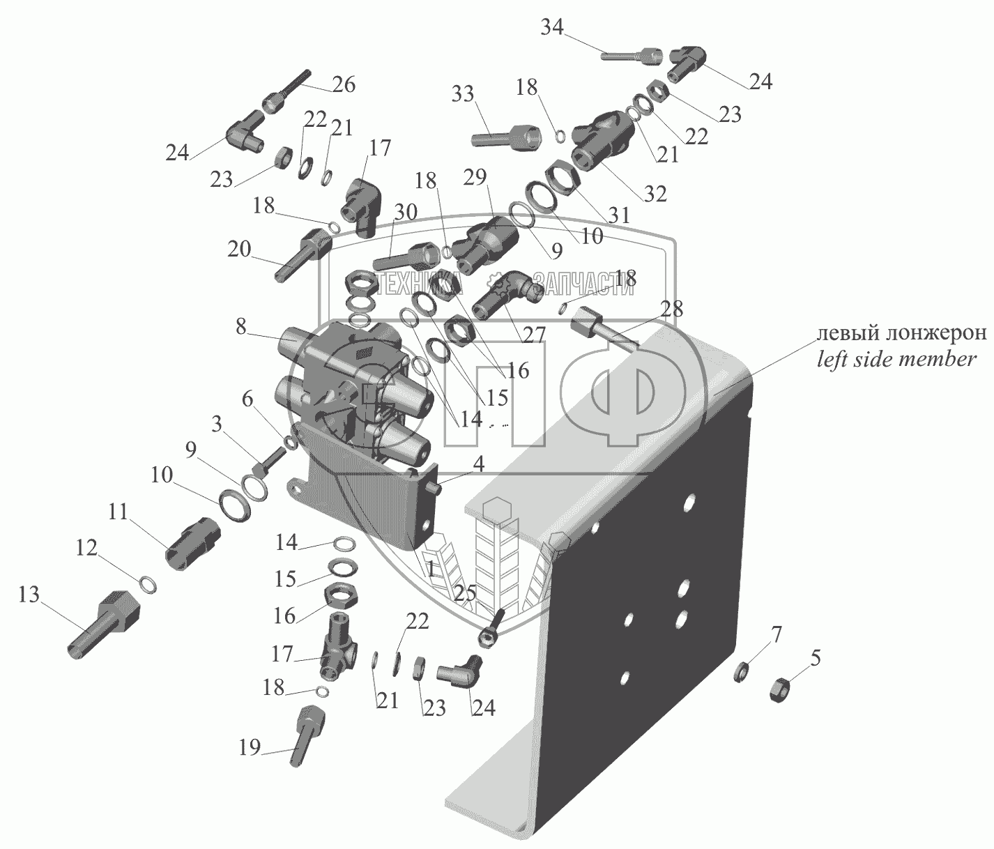 Каталог запасных частей к технике: МАЗ-650119. Крепление четырехконтурного клапана 650107-3515002