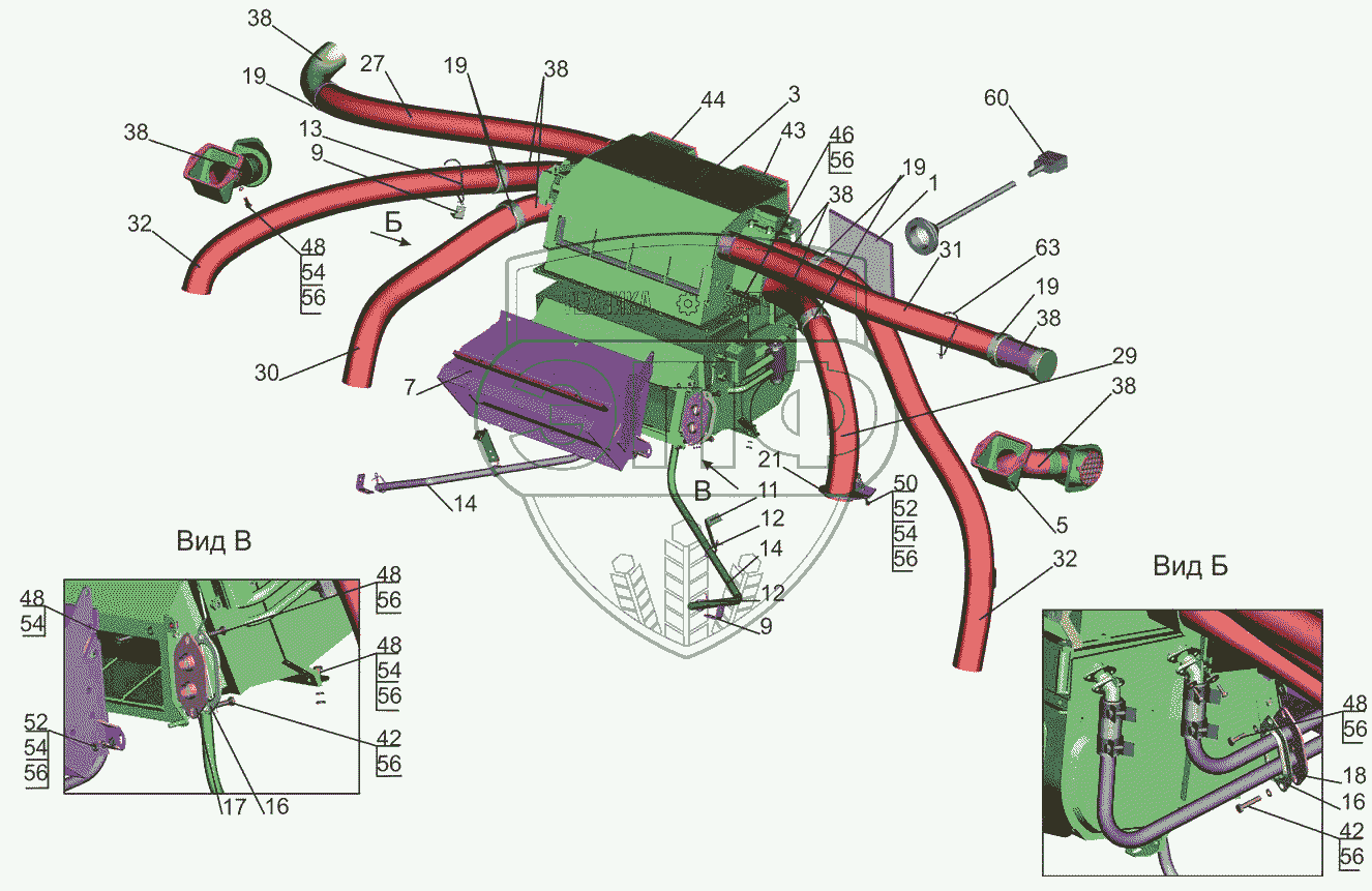 Каталог запасных частей к технике: МАЗ-6501B9. Установка отопителя 631019-8100001-010