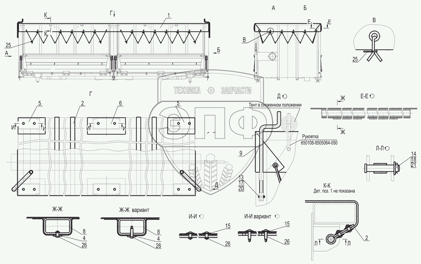 Каталог запасных частей к технике: МАЗ-6501B9. Установка тента 6501B9-8500004-050