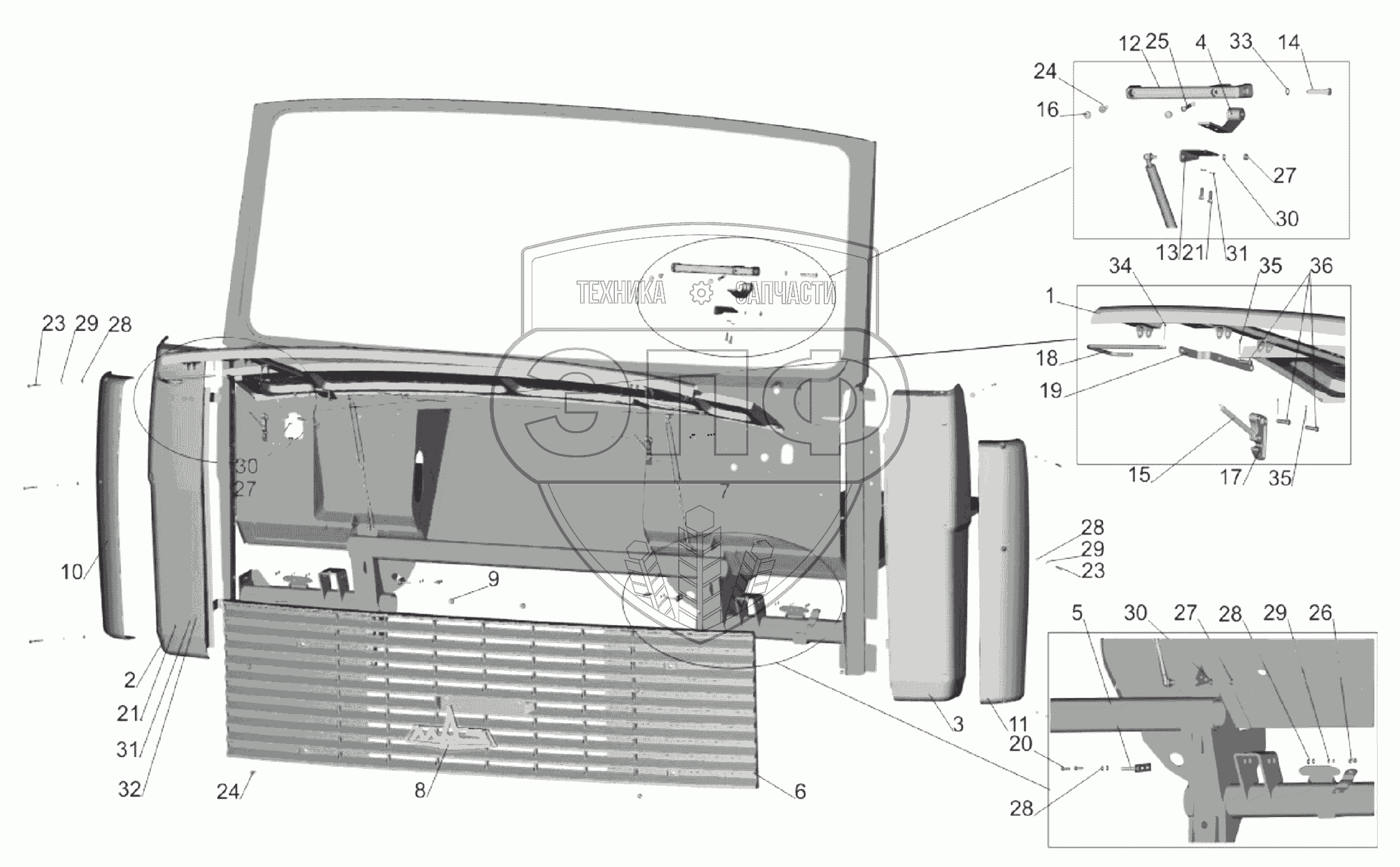 Каталог запасных частей к технике: МАЗ-651705. Установка облицовки передка 64221-8400018