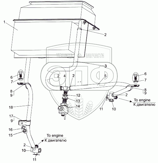 Каталог запасных частей к технике: МАЗ-74131. Установка трубопроводов отопителя кабины