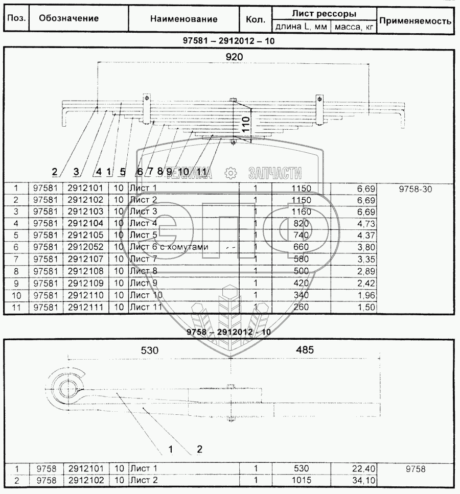 Каталог запасных частей к технике: МАЗ Справочник. Рессоры прицепов и полуприцепов
