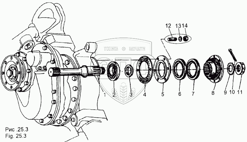 Каталог запасных частей к технике: МЗКТ-65158. Мост средний. Вал задний