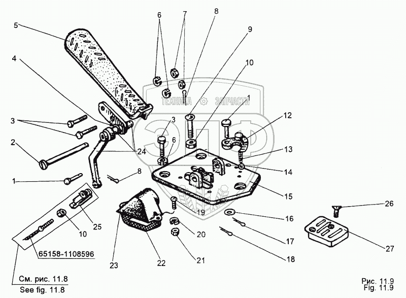 Каталог запасных частей к технике: МЗКТ-65158. Педаль с кронштейном