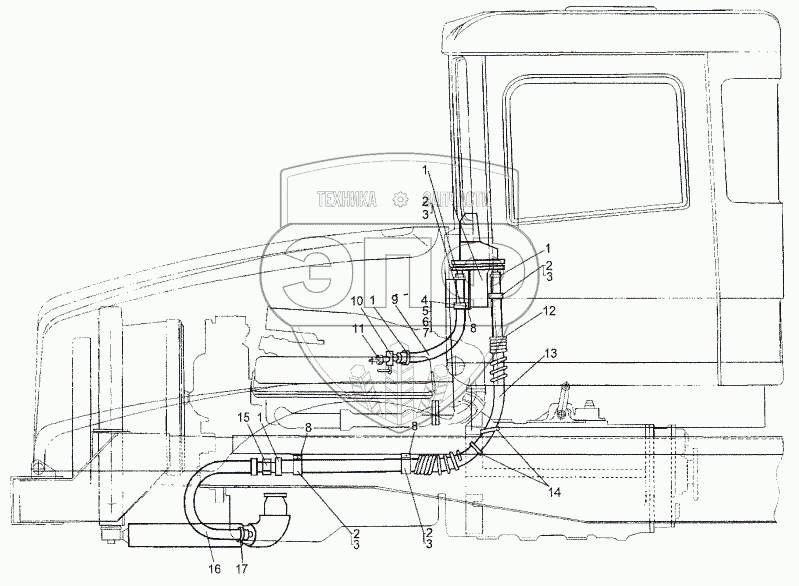 Каталог запасных частей к технике: МЗКТ-652511. Установка трубопроводов отопителя
