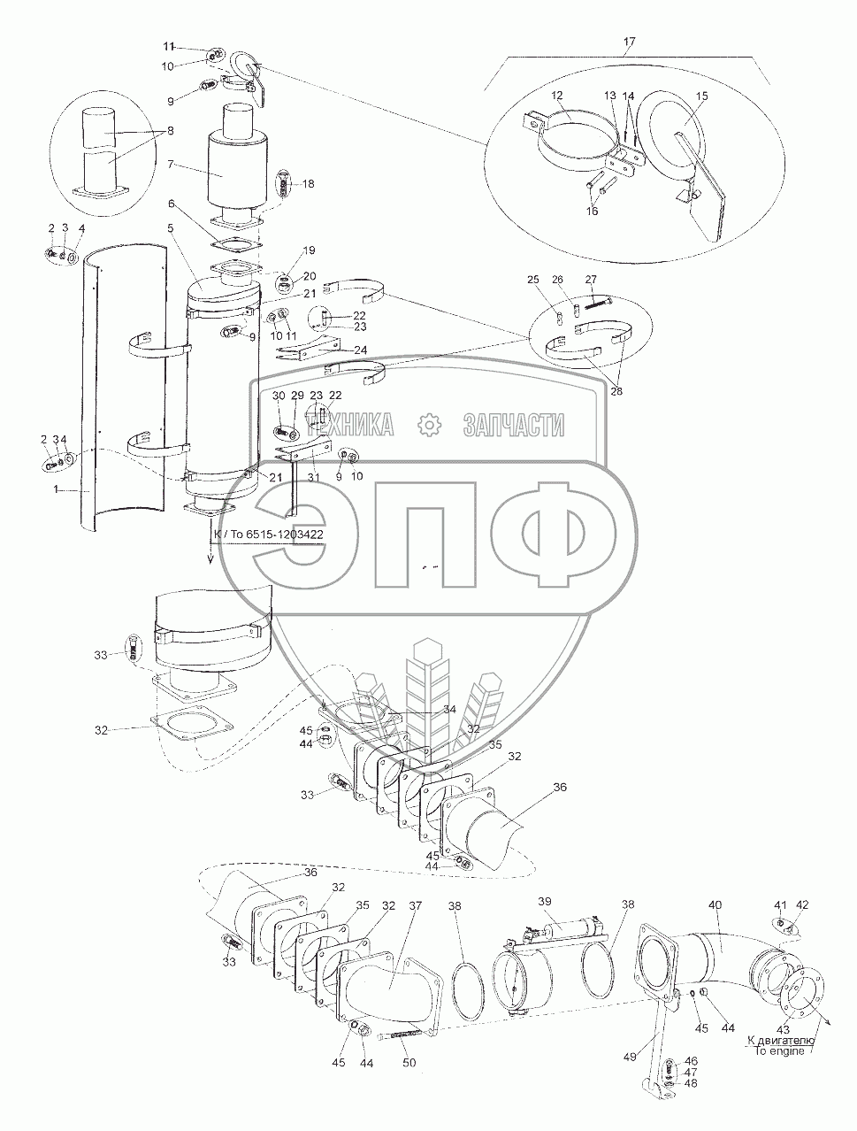 Каталог запасных частей к технике: МЗКТ-7401. Установка системы выпуска отработавших газов