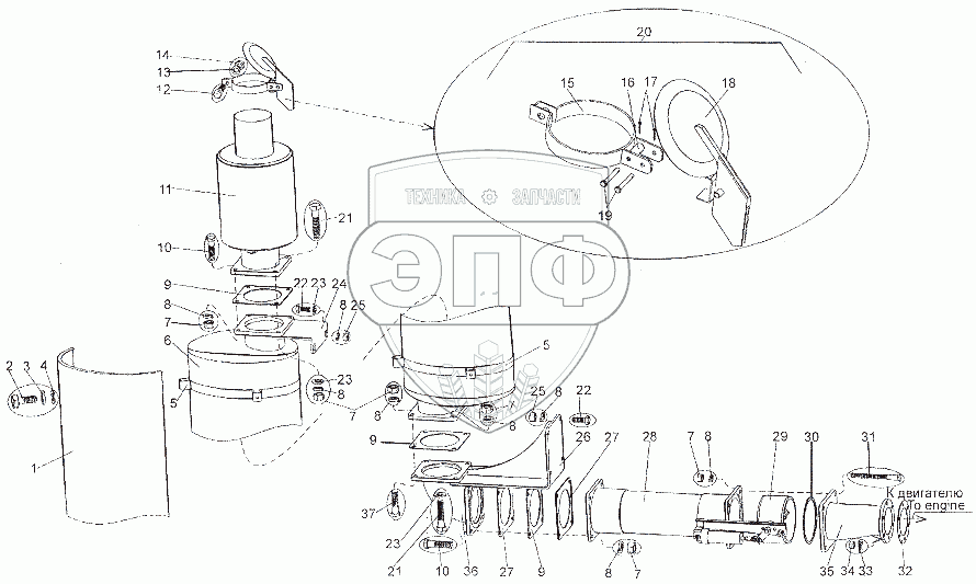 Каталог запасных частей к технике: МЗКТ-7401. Установка системы выпуска отработавших газов