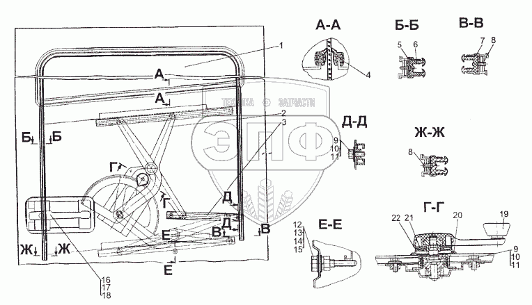 Каталог запасных частей к технике: МЗКТ-74296. Установка стеклоподъёмника задней двери