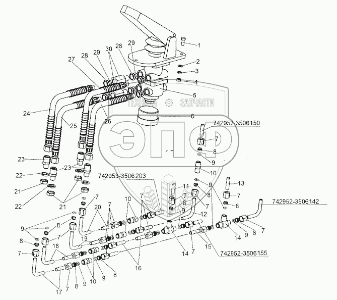 Каталог запасных частей к технике: МЗКТ-74296. Установка тормозного крана