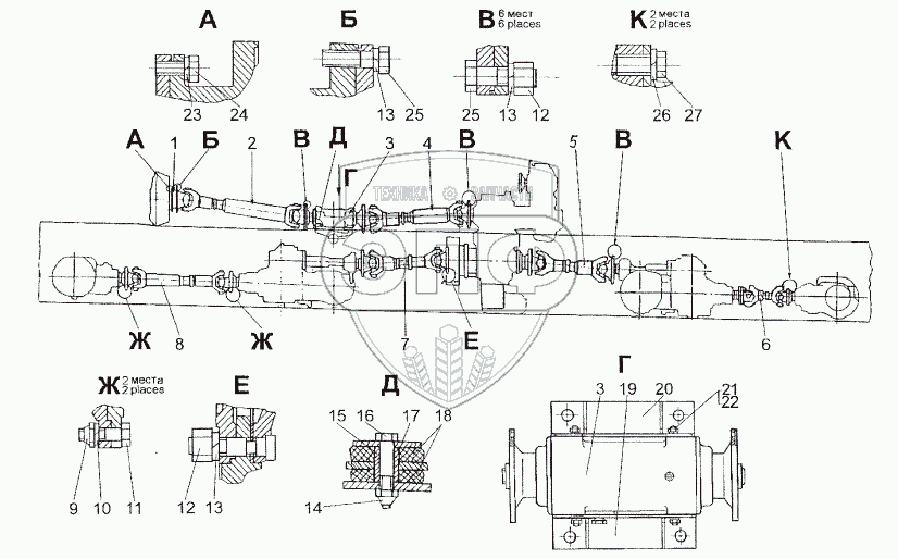 Каталог запасных частей к технике: МЗКТ-74296. Установка валов трансмиссионных