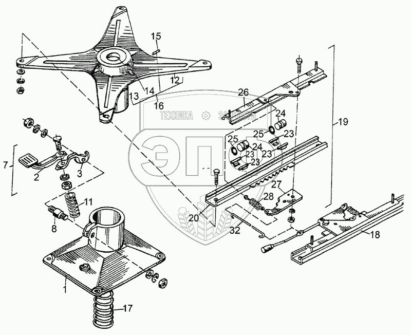 Каталог запасных частей к технике: МЗКТ-79092. Подставка сиденья и регулировочный механизм