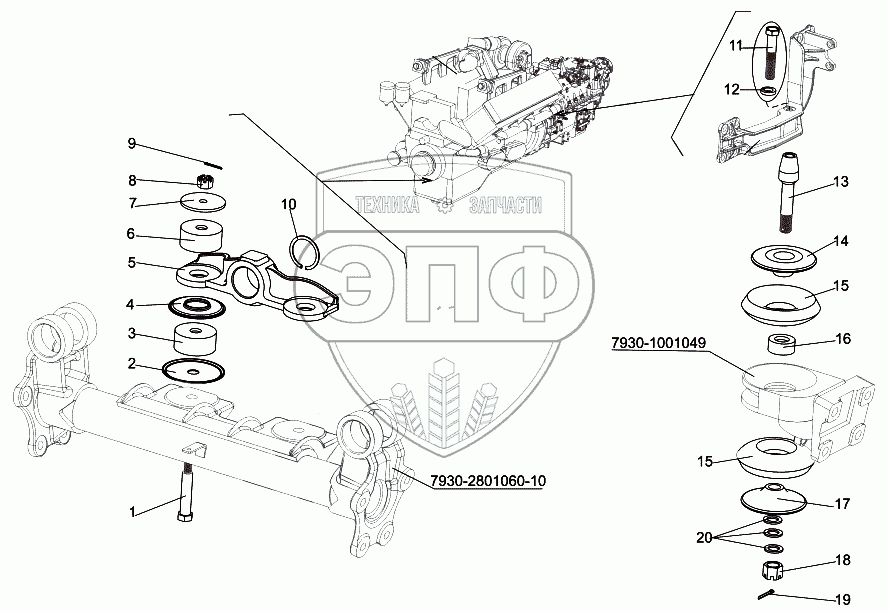 Каталог запасных частей к технике: МЗКТ-7930-200. Установка двигателя