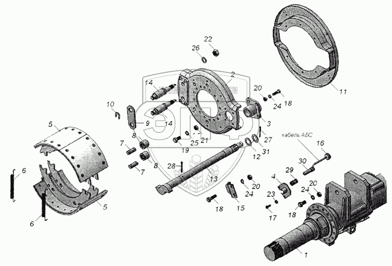 Каталог запасных частей к технике: Нефтекамский автозавод 9509. Ось ступицами и тормозами