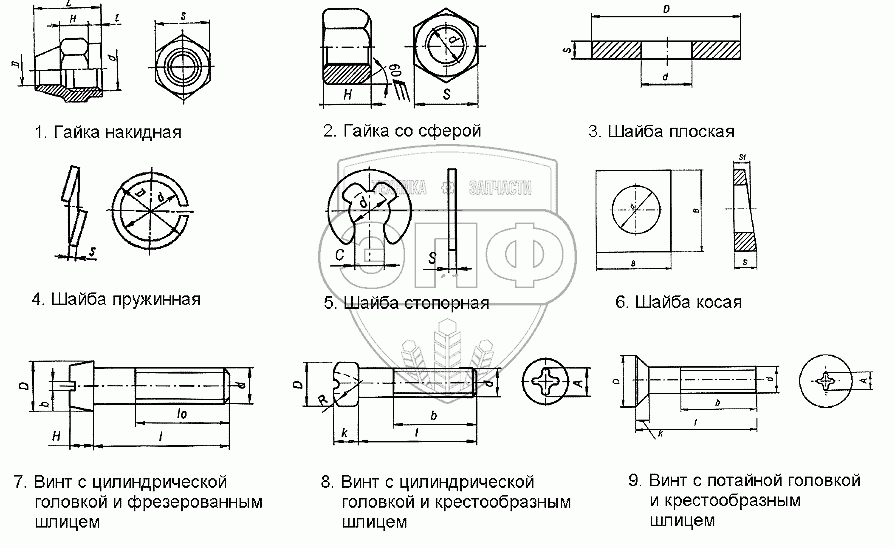 Каталог запасных частей к технике: Нефтекамский автозавод 96741. Гайки, шайбы, винты