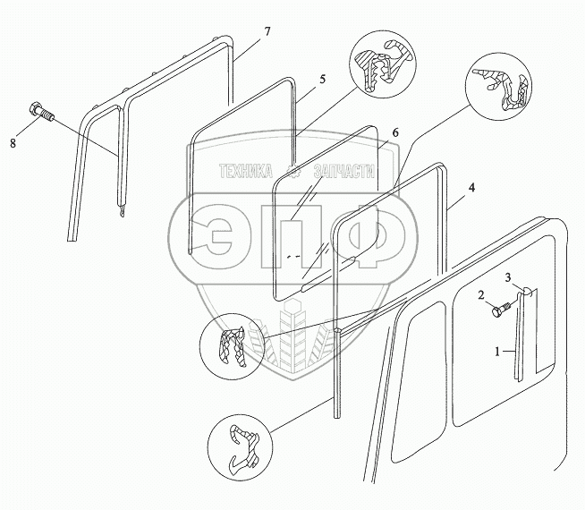 Каталог запасных частей к технике: Shaanxi DeLONG Е-3 (самосвал). Окно левой двери