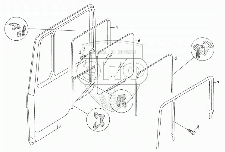 Каталог запасных частей к технике: Shaanxi DeLONG Е-3 (тягач). Окно правой двери