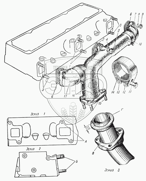| 17 | 131-1008057 | Патрубок выпускного газопровода передний левый и задний правый | Нет на складе |