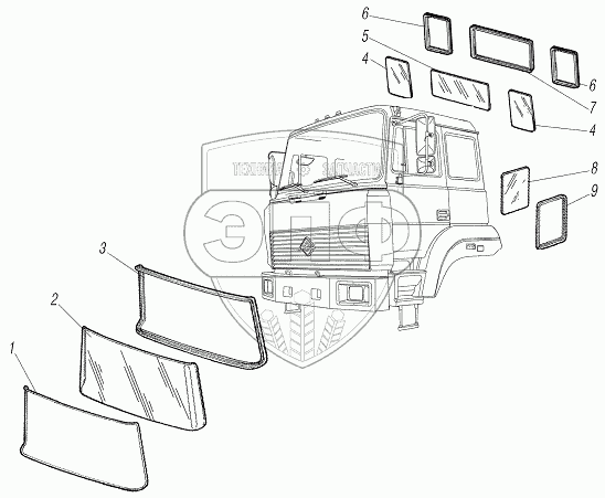 Каталог запасных частей к технике: УралАЗ УРАЛ-44202-3511-80. Стекла кабины