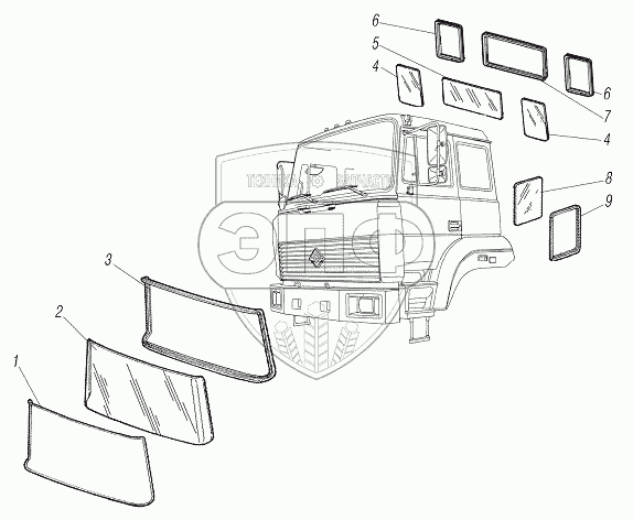 Каталог запасных частей к технике: УралАЗ УРАЛ-44202-3511-80. Стекла кабины
