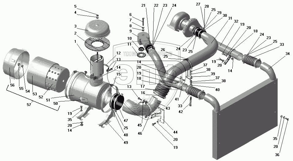 Каталог запасных частей к технике: УралАЗ УРАЛ-5557-40. Воздухопровод с воздушным фильтром