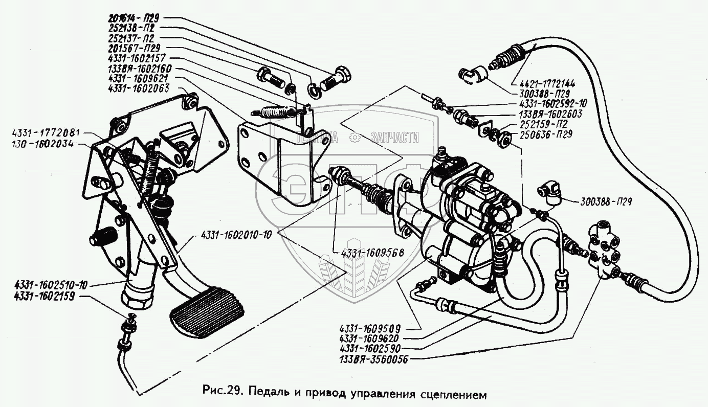 Каталог запасных частей к технике: ЗИЛ-433100. Педаль и привод управления сцеплением