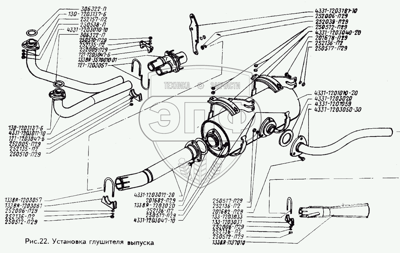 Каталог запасных частей к технике: ЗИЛ-433100. Установка глушителя выпуска