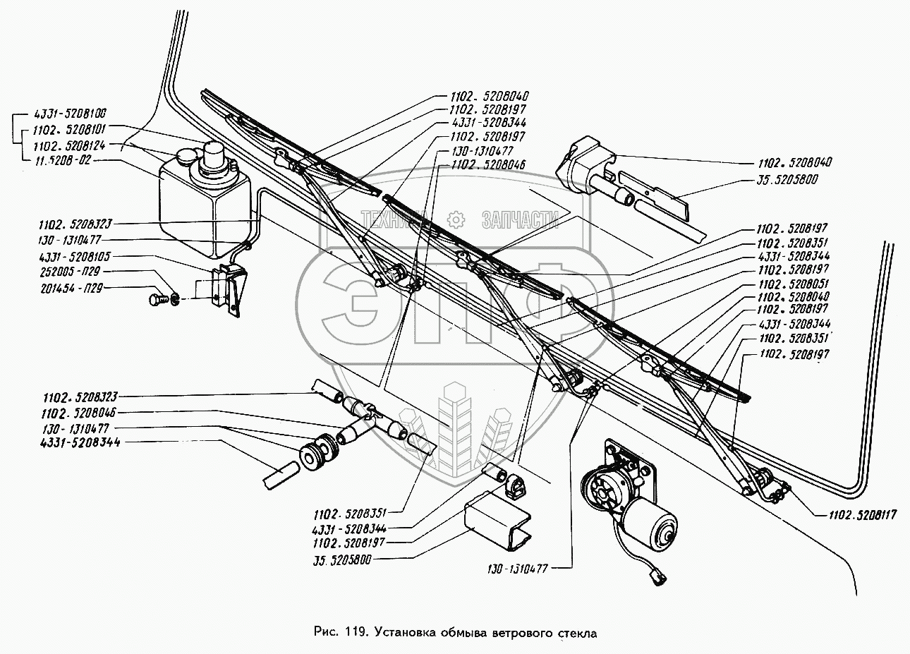 Каталог запасных частей к технике: ЗИЛ-442160. Установка обмыва ветрового стела