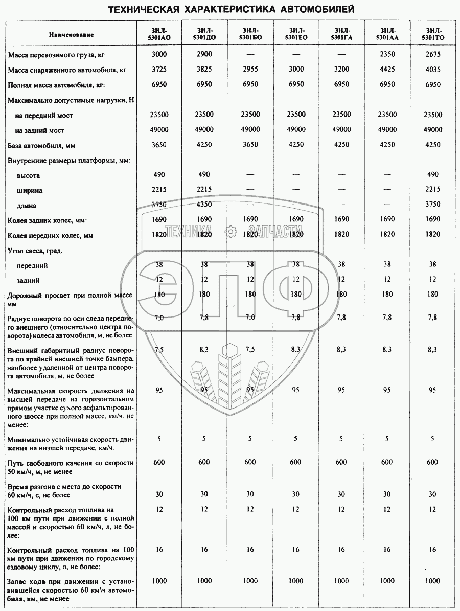 Каталог запасных частей к технике: ЗИЛ-5301. Техническая характеристика