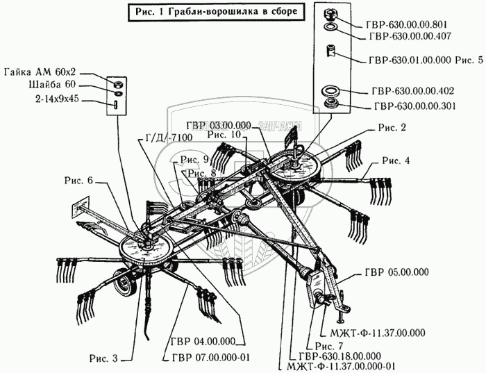 Каталог запасных частей к технике: Бобруйскагромаш ГВР-630. Грабли-ворошилка в сборе