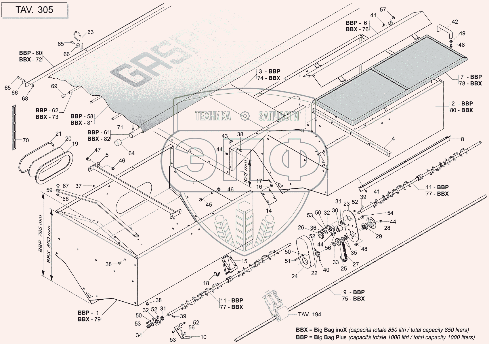 Каталог запасных частей к технике: Gaspardo MT. SINGLE FERTILIZER SPREADER