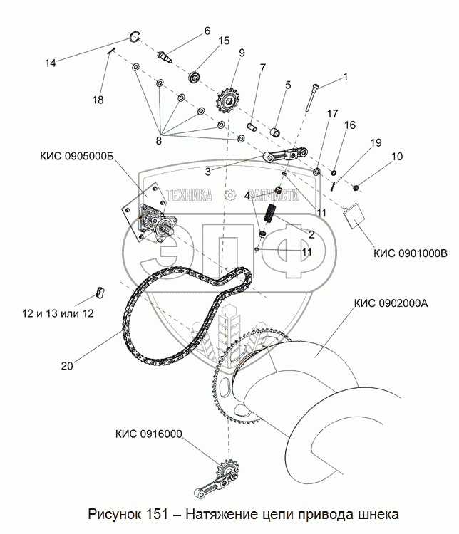 Каталог запасных частей к технике: Гомсельмаш КСК-100А-3. Натяжение цепи привода шнека
