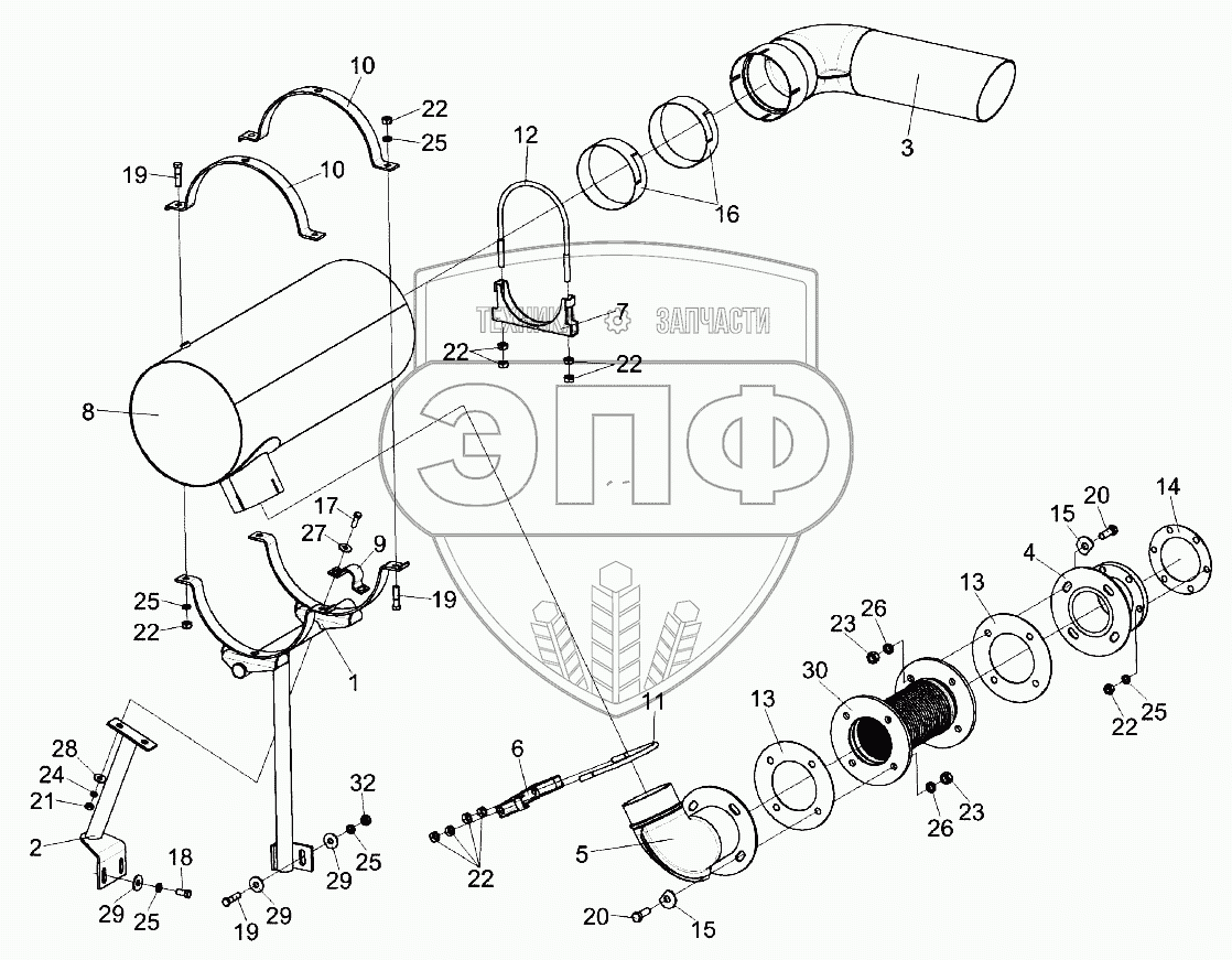 Каталог запасных частей к технике: Гомсельмаш KЗС-812. Установка глушителя КЗК-8К-0106060