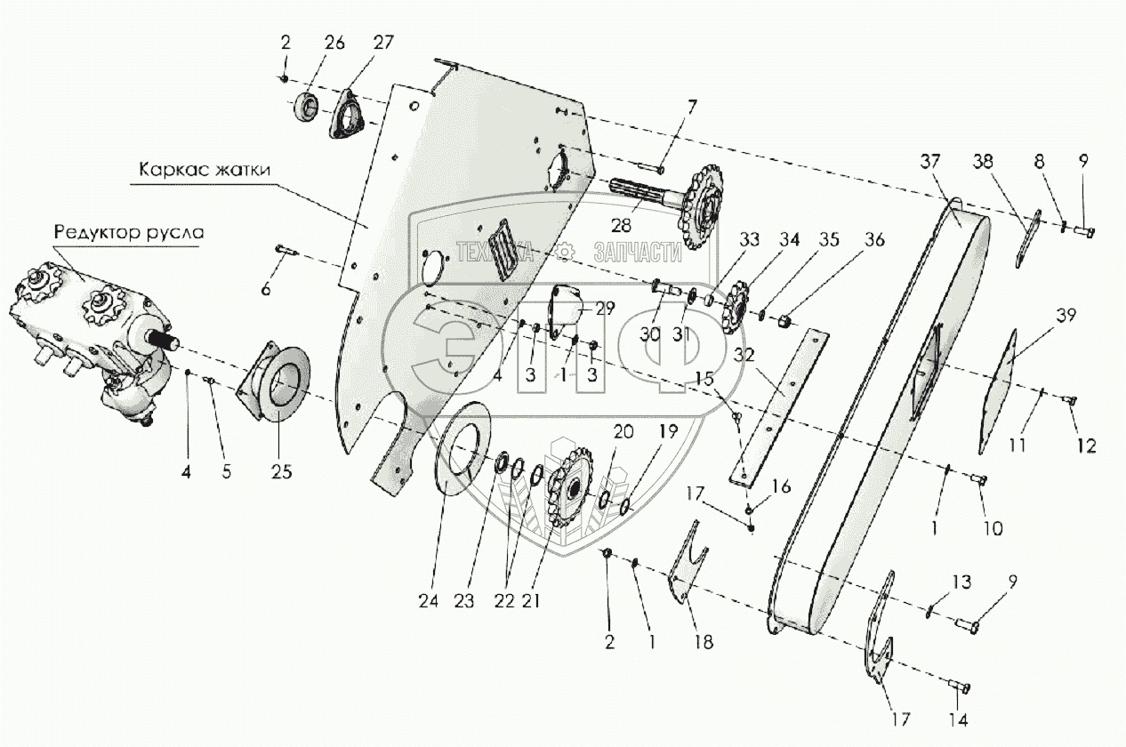 Каталог запасных частей к технике: Клевер ППК-82 "Argus". Привод жатки (вид слева)