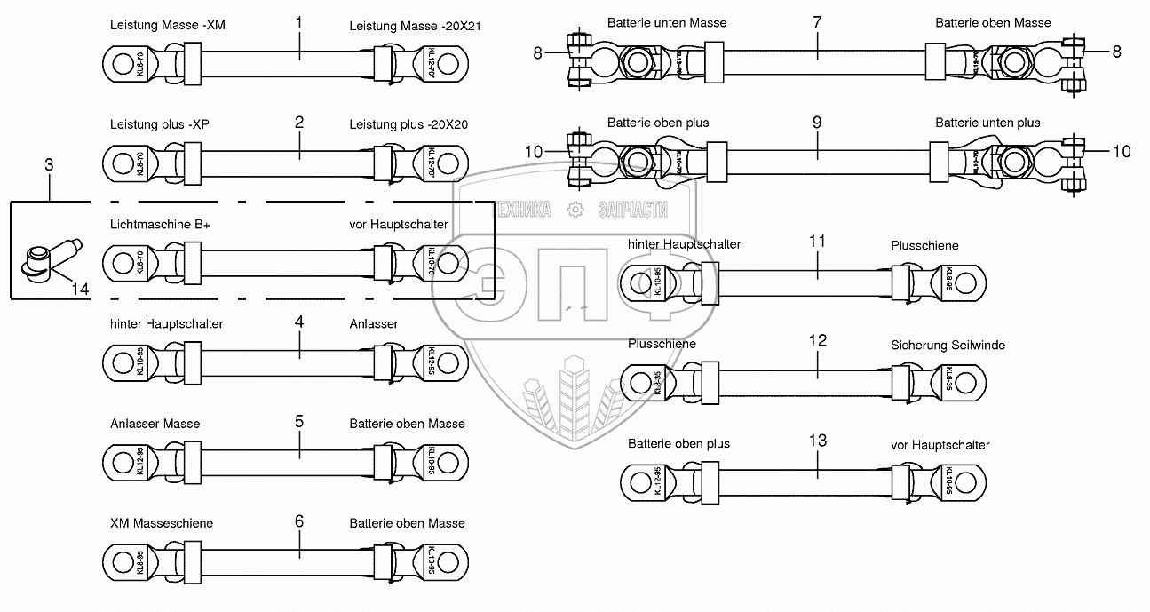 Каталог запасных частей к технике: KRONE BIG-X-650. Battery and ground cable