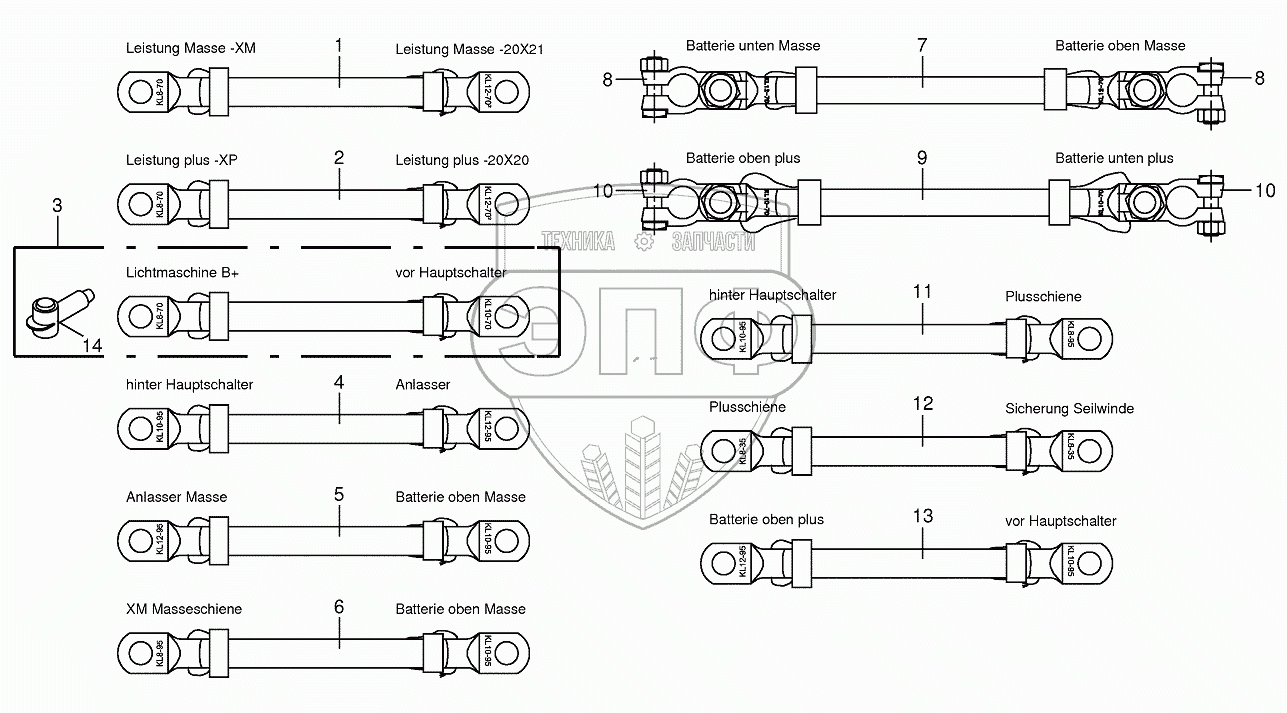 Каталог запасных частей к технике: KRONE BIG-X-650. Battery and ground cable