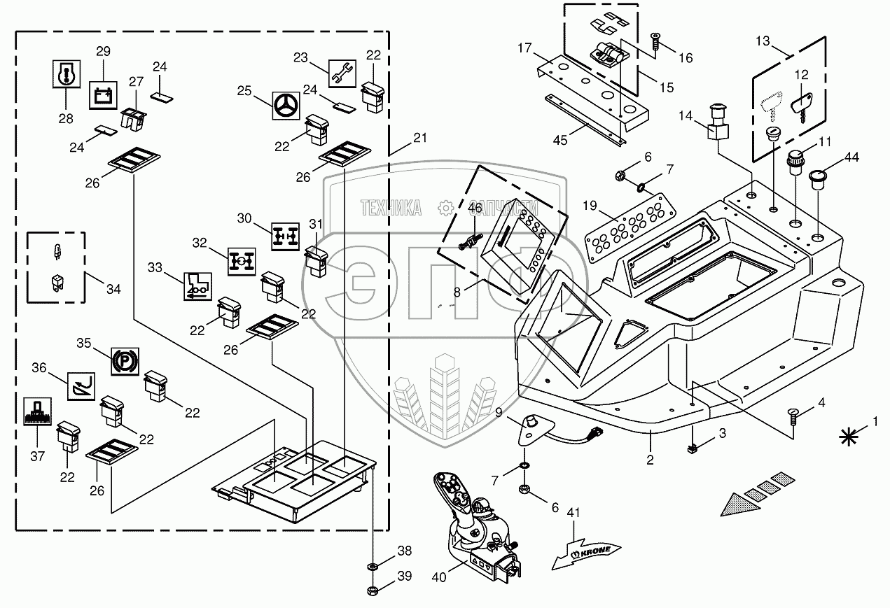 Каталог запасных частей к технике: KRONE BIG-X-650. Control box mounting parts-top