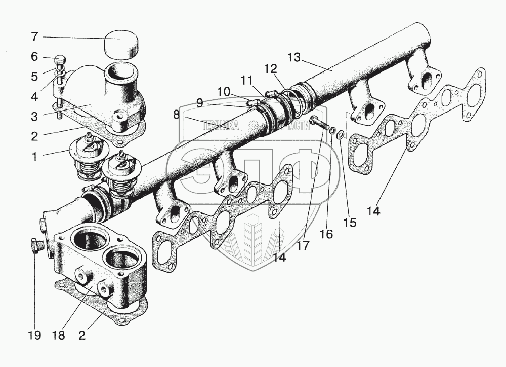 Каталог запасных частей к технике: МТЗ-1523. Труба водосборная и термостаты