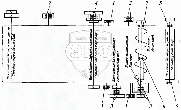 Каталог запасных частей к технике: РСМ Дон 1500А. Схема расположения подшипников измельчителя ПКН-1500