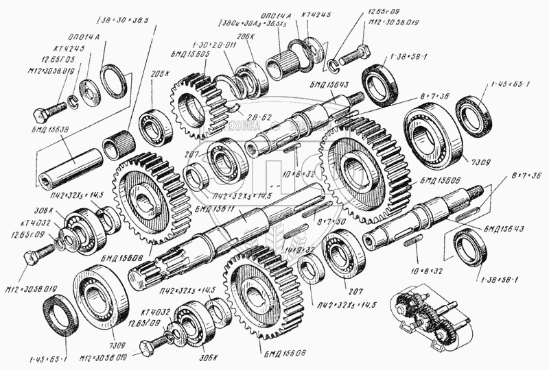 Каталог запасных частей к технике: ТеКЗ БМ-6А. Редуктор центральный. Валы и шестерни