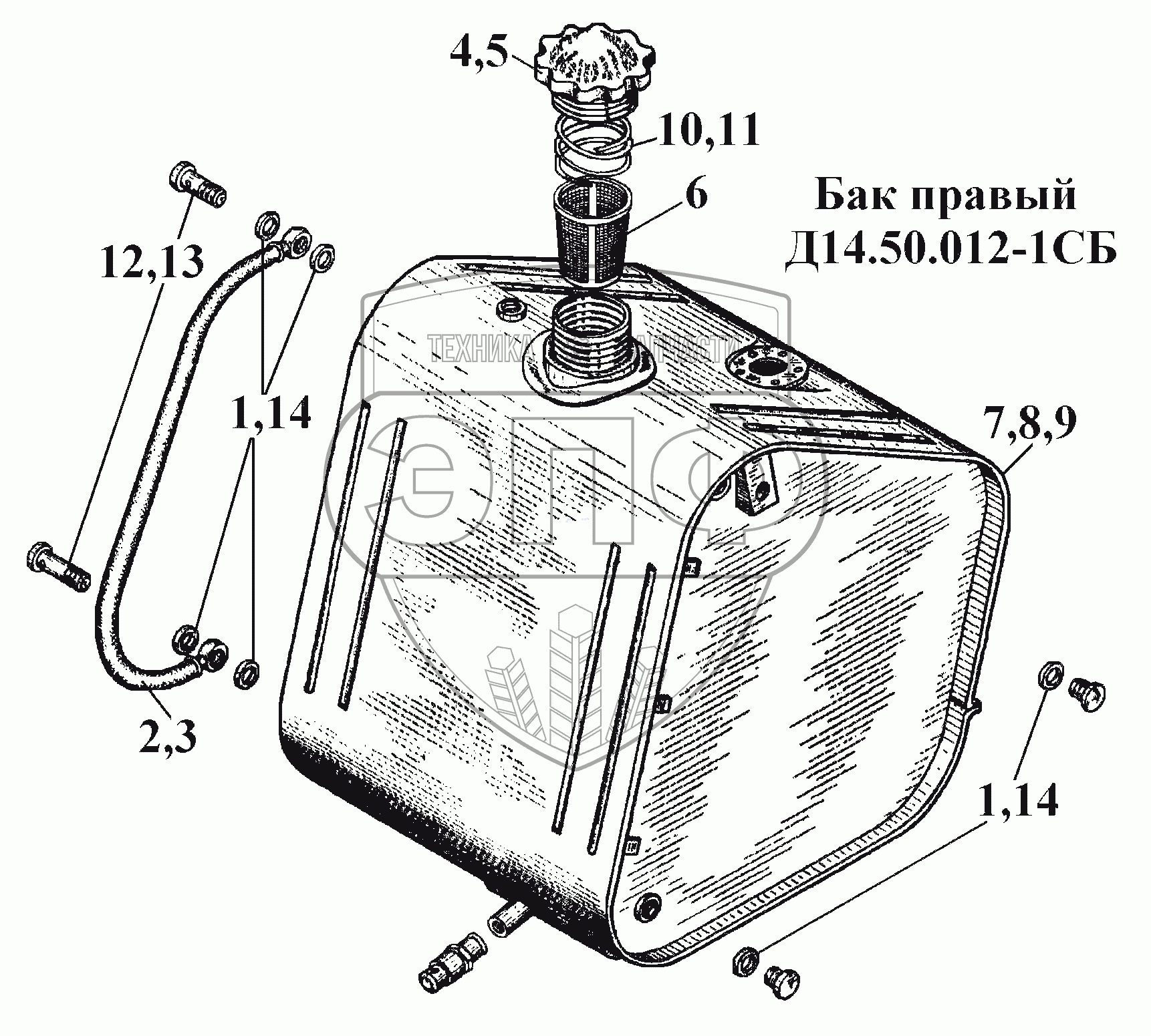 Каталог запасных частей к технике: ВгТЗ ВТ-100Д. Бак правый Д14.50.012-1СБ