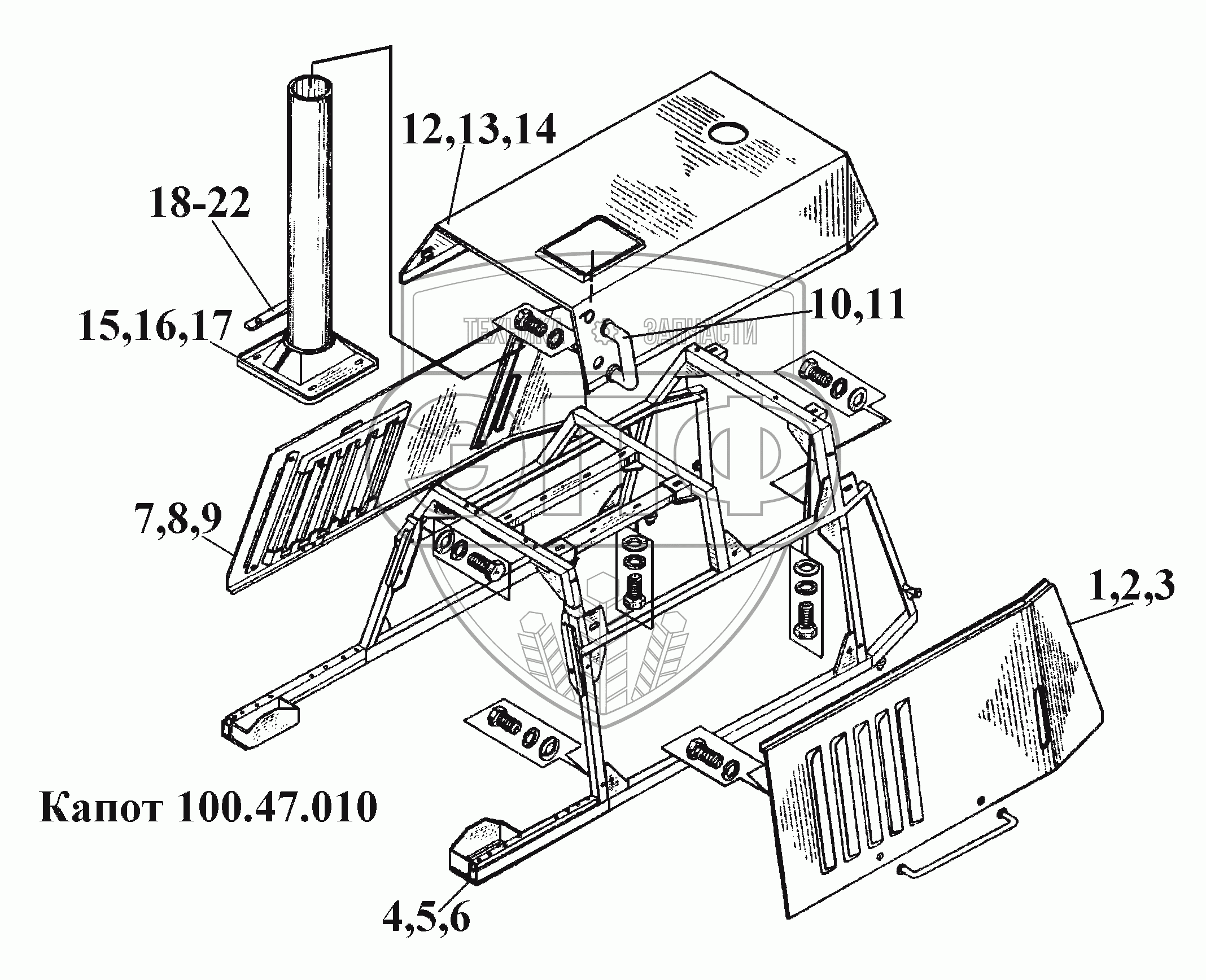 Каталог запасных частей к технике: ВгТЗ ВТ-100Д. Капот 100.47.010 (3)