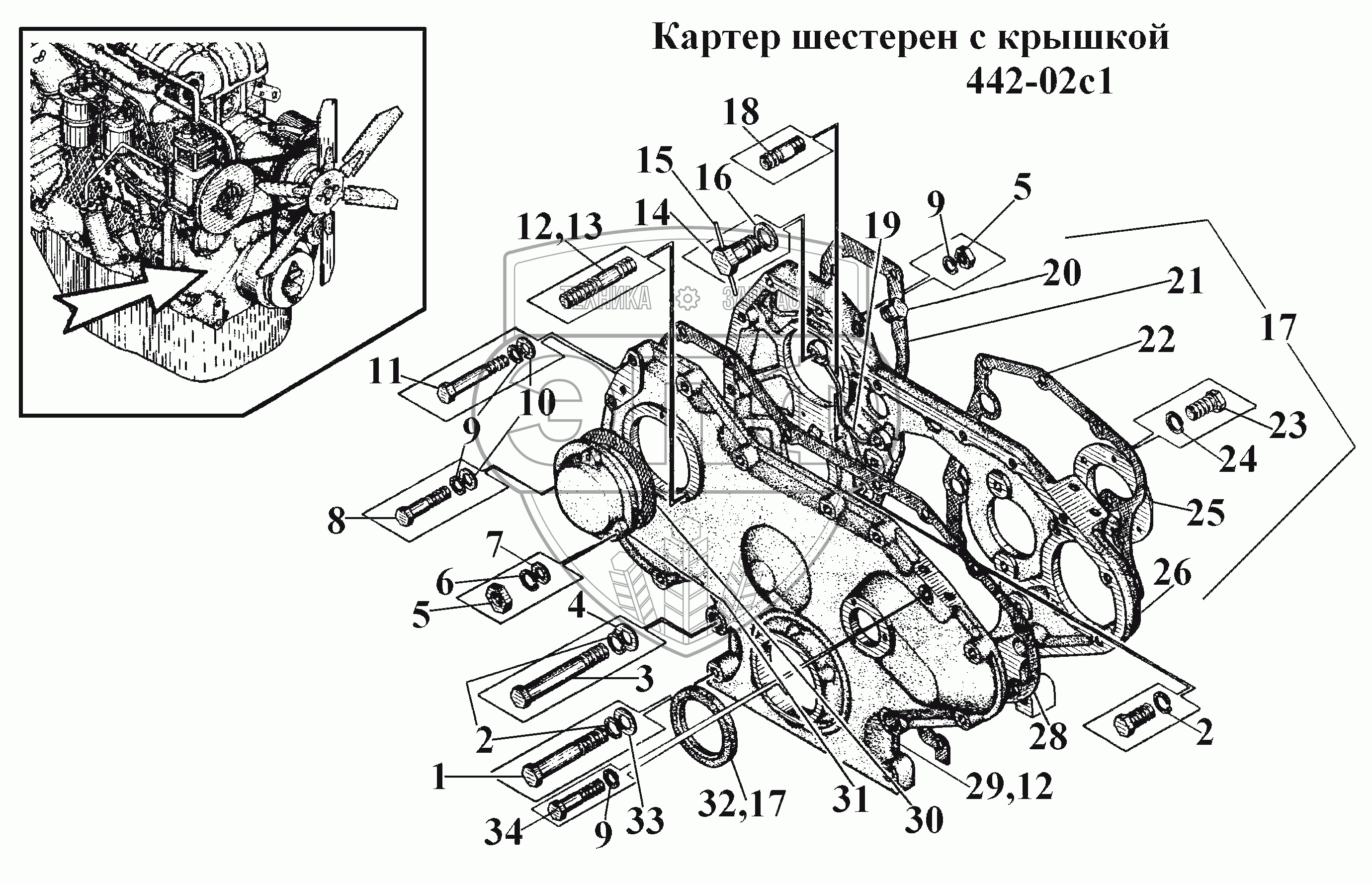 Каталог запасных частей к технике: ВгТЗ ВТ-100Д. Картер шестерен с крышкой 442-02с1