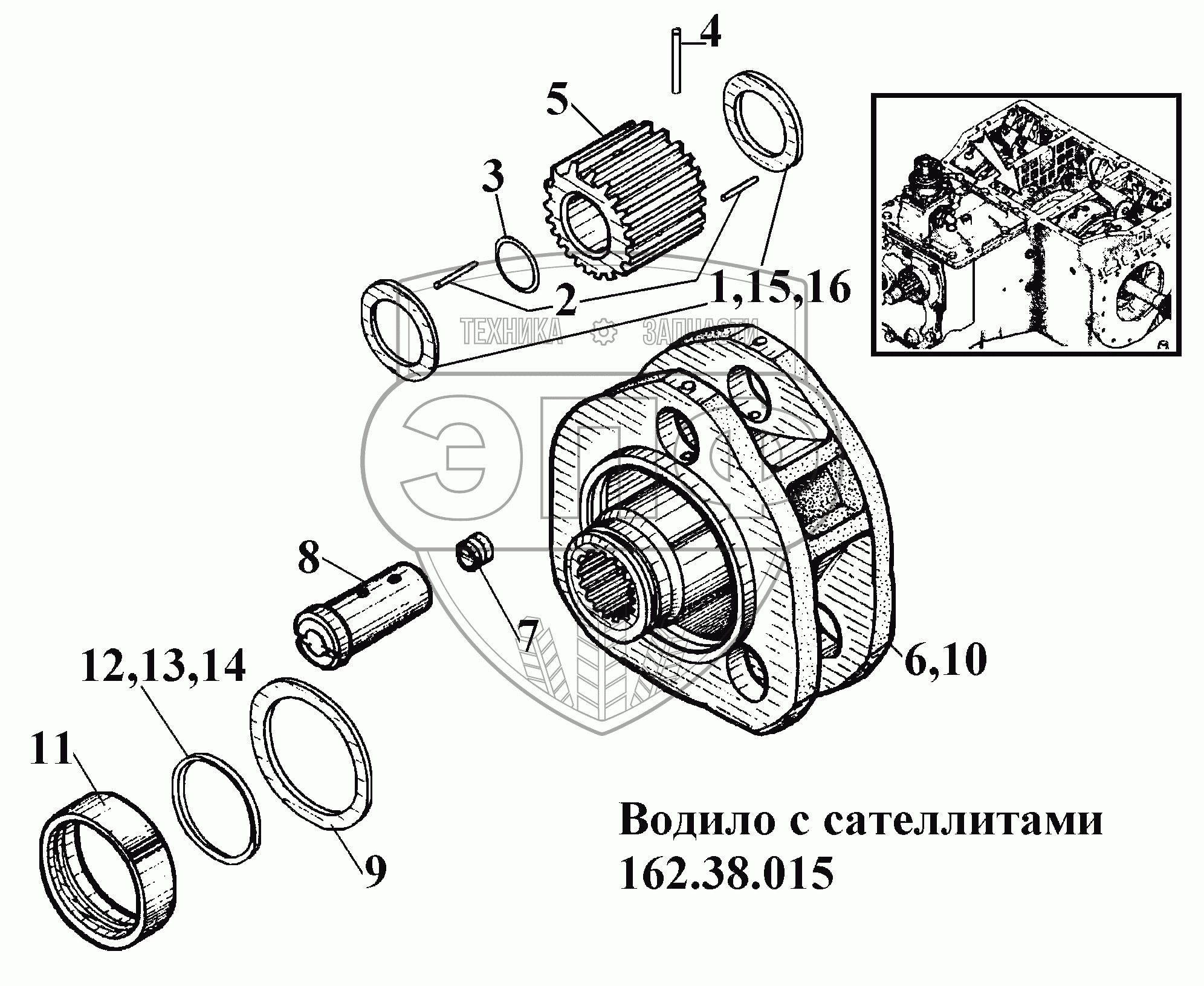 Каталог запасных частей к технике: ВгТЗ ВТ-100Д. Водило с сателлитами 162.38.015