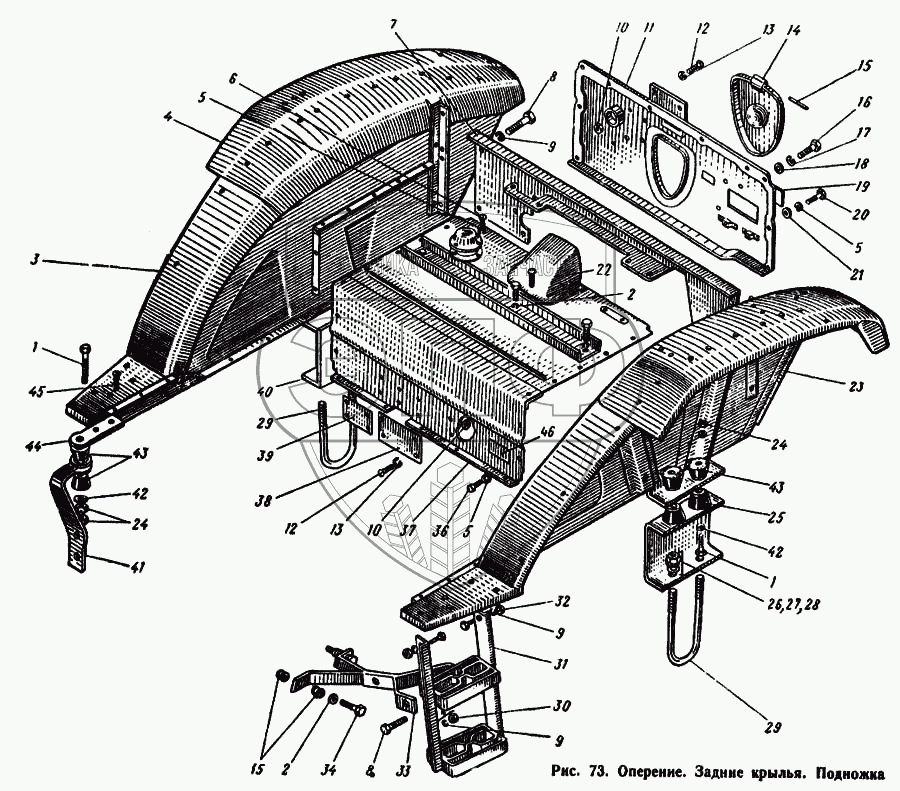 Каталог запасных частей к технике: ЮМЗ-6Л. Оперение. Задние крылья. Подножка