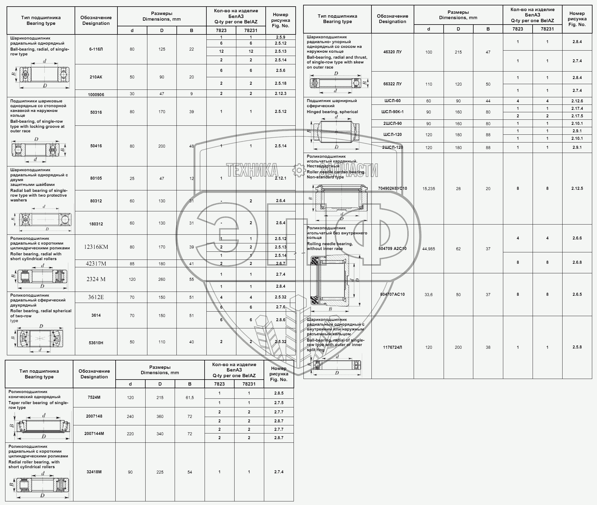 Каталог запасных частей к технике: БелАЗ-7823. Подшипники
